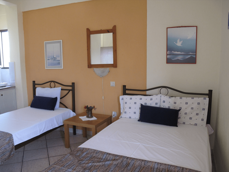 Svaka smeštajna jedinica poseduje kompletno opremljenu čajnu kuhinju (frižider, rešo, osnovno posuđe, aspirator), kupatilo (tuš/WC), TV, Wi-Fi i terasu, kao i klima uređaj koji se doplaćuje na licu mesta (5 € dnevno po studiju). Kreveti su standardnih dimenzija. Svaka smeštajna jedinica poseduje  garnituru za sedenje. U vili nema peškira.