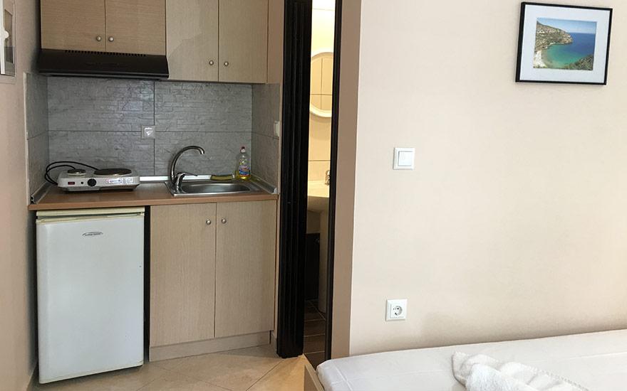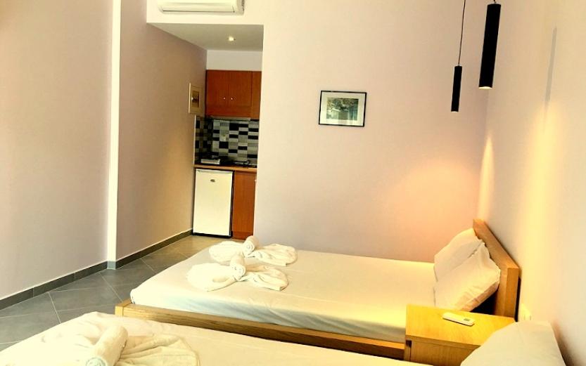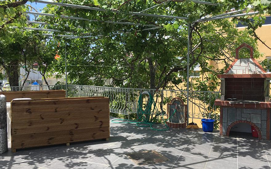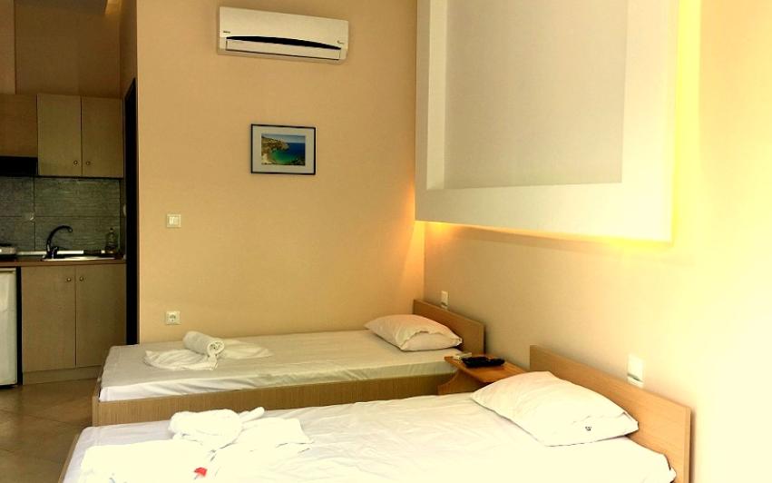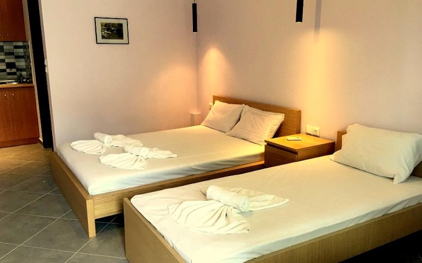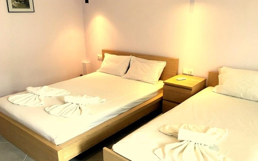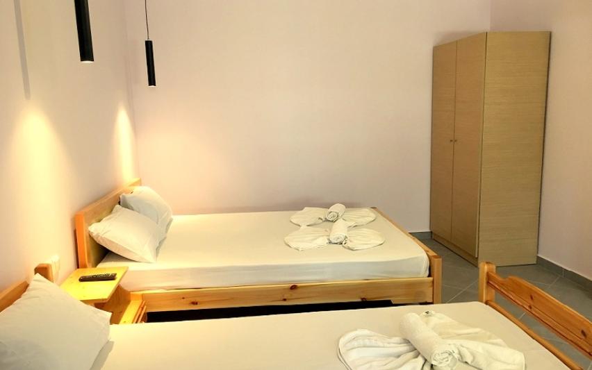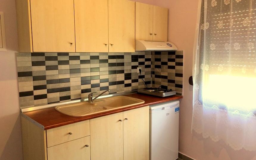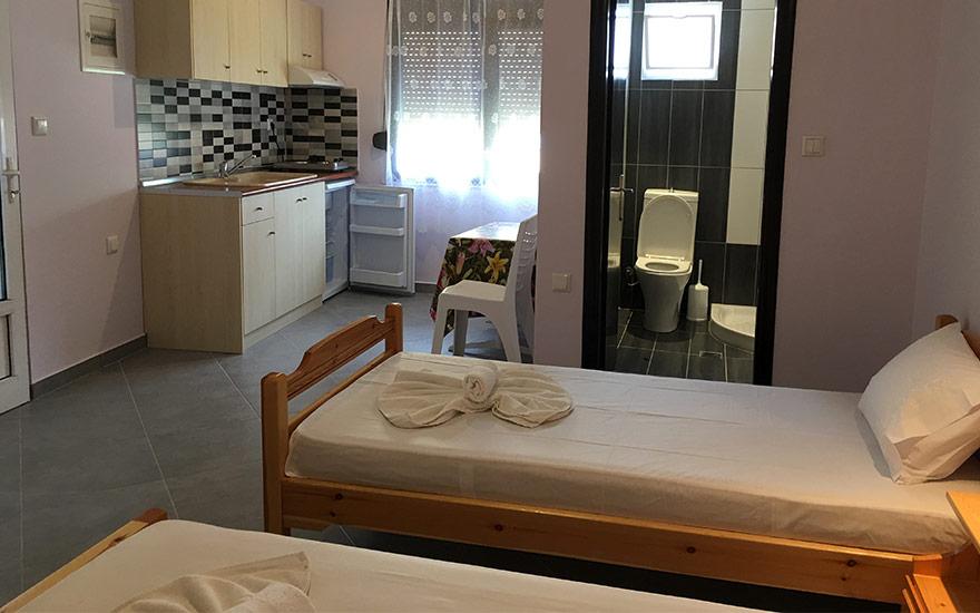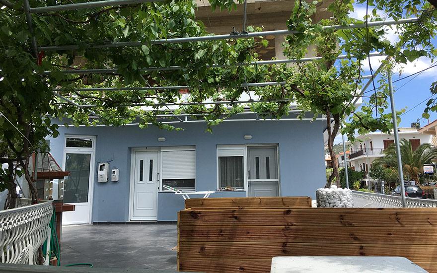 Opis: Ova vila nudi dvokrevetne i trokrevetne studije i apartman za 4 osobe. Sve smeštajne jedinice se nalaze na visokom prizemlju. Apartman se sastoji od dve spavaće sobe. U jednoj od soba je kuhinja sa jednim francuskim i singl lezajem,a u drugoj sobi je jedan singl ležaj. Svaka smeštajna jedinica poseduje kompletno opremljenu kuhinju, kupatilo (tuš/WC),terasu, TV, komarnike. Svaka smeštajna jedinica raspolaže klima uređajem čije se korišćenje doplaćuje na licu mesta (5 € dnevno po smeštajnoj jedinici). Ova doplata nije obavezna. Ispred kuće se nalazi roštilj koji mogu koristiti svi gosti vile. Vila ima peškire. Vila nema parking. Posteljina i peškiri se menjaju svakih 5 dana.