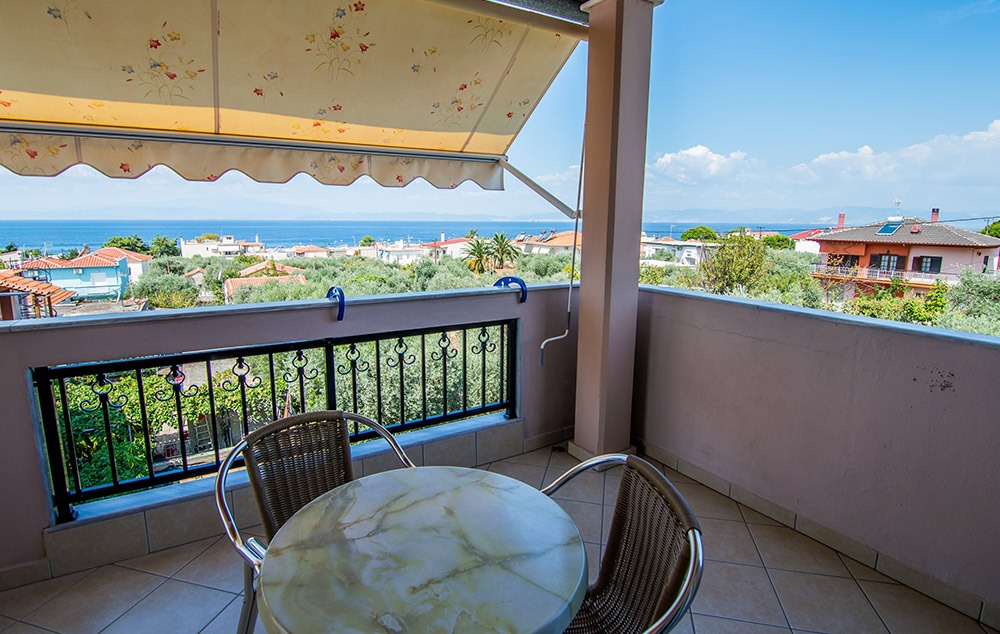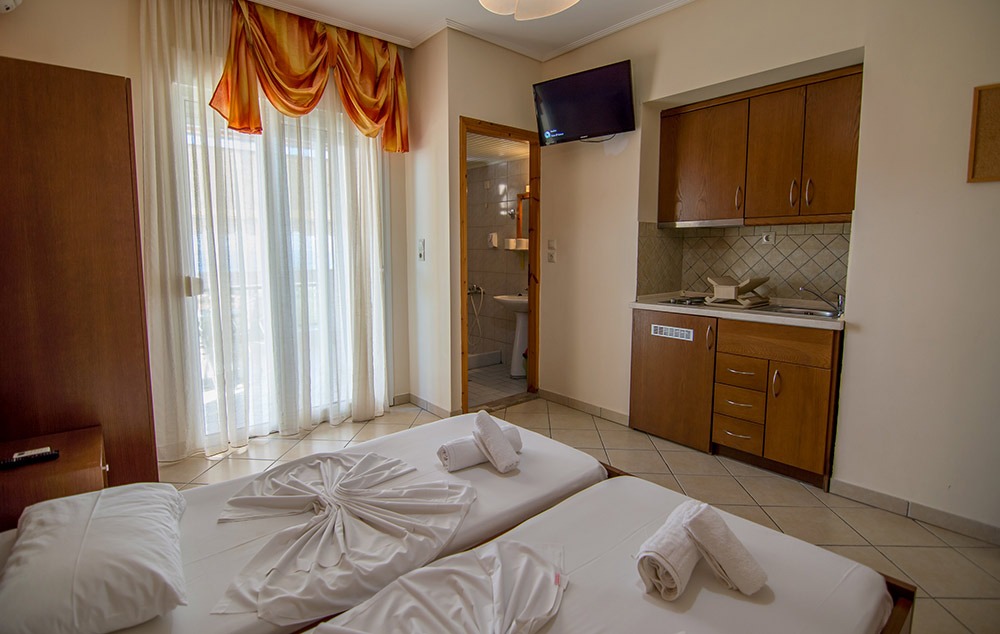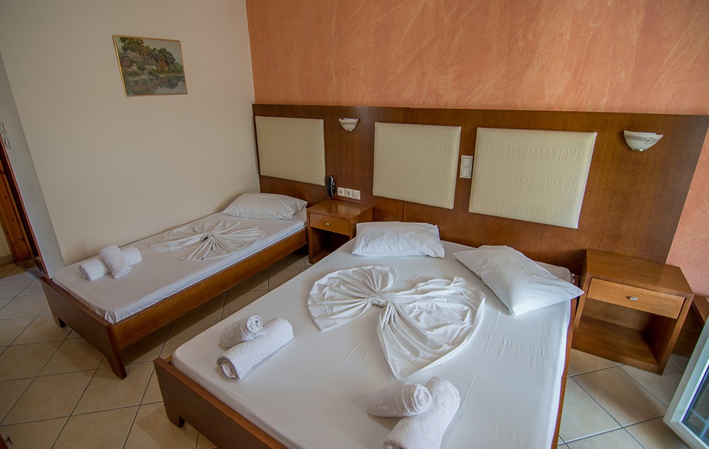 Opis: Okružena je zelenilom i maslinjacima. Mali porodični hotel koji se nalazi u neposrednoj blizini centra mesta Skala Sotiros, kao i šetališta, restorana, prodavnica. Vila ima dvorište, bazen, ležaljke oko bazena kao, pool bar, roštilj u dvorištu. Vila raspolaže dvokrevetnim i trokrevetnim studijima. Svaki studio poseduje kompletno opremljenu čajnu kuhinju (frižider, posudje), TV, klima uređaj čije se korišćenje naplaćuje 5 eur po danu (ova doplata nije obavezna), Wi-Fi i parking prostor. Sve smeštajne jedinice imaju komarnike. U okviru vile nalazi se toalet i prostor za odlaganje stvari poslednjeg dana boravka. Posteljina i peškiri se menjaju svakih 5 dana.