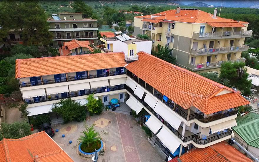 Opis: Vila Pefkary Bay je odlično pozicionirana na šetalištu koje se prostire duž plaže u mestu Pefkari. Vila raspolaže dvokrevetnim i trokrevetnim studijima koji imaju bočni pogled na more i smešteni su na prvom i drugom spratu, četvorokrevetnim apartmanima sa pogledom na dvorište na drugom spratu, i četvorokrevetnim apartmanom na trećem spratu (potkrovlje bez kosine), koji ima direktan pogled na more. Terase svih smeštajnih jedinica su na zajedničkim balkonima, jednim delom odvojene gelenderima.