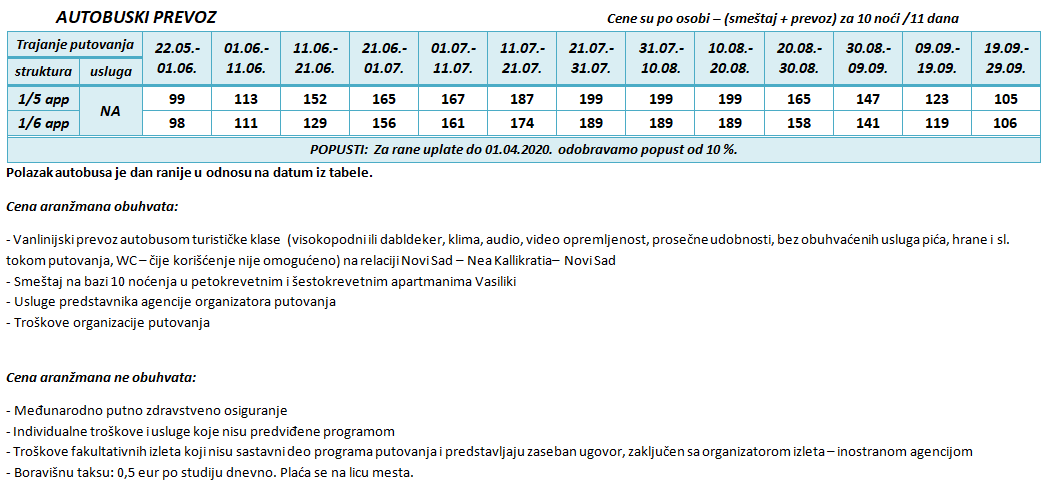 – za uplatu do 01.04.2023. popusti zavise od izabrane smene, objekta i načina prevoza. Uz svaku tabelu sa cenama naznačeni su i iznosi popusta.